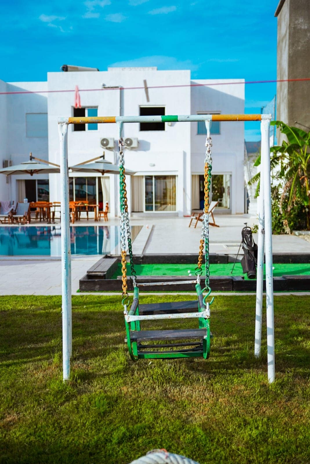 Balançoires, mini terrain de basket-ball, pétanque, tir à l’arc, mini-golf, et un petit bassin de poissons pour une expérience en plein air complète