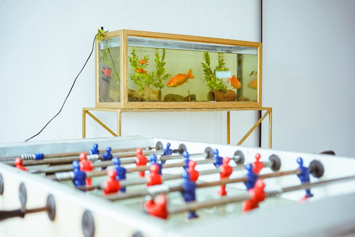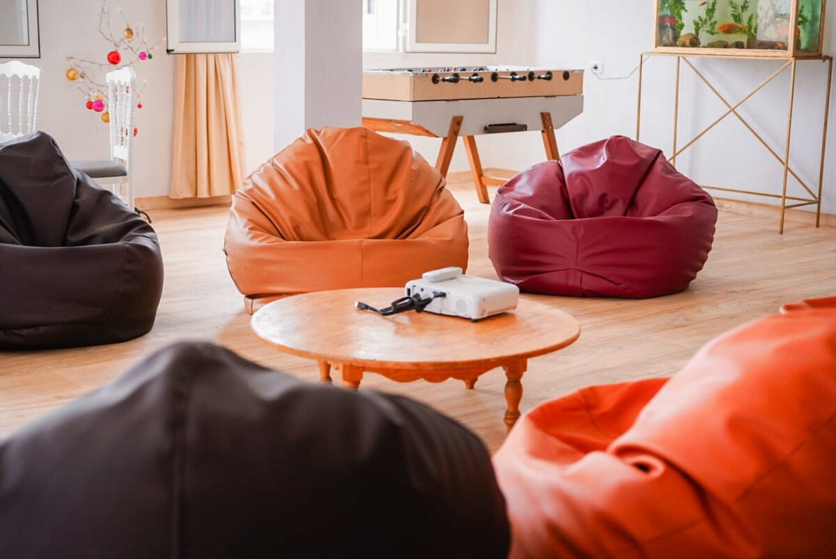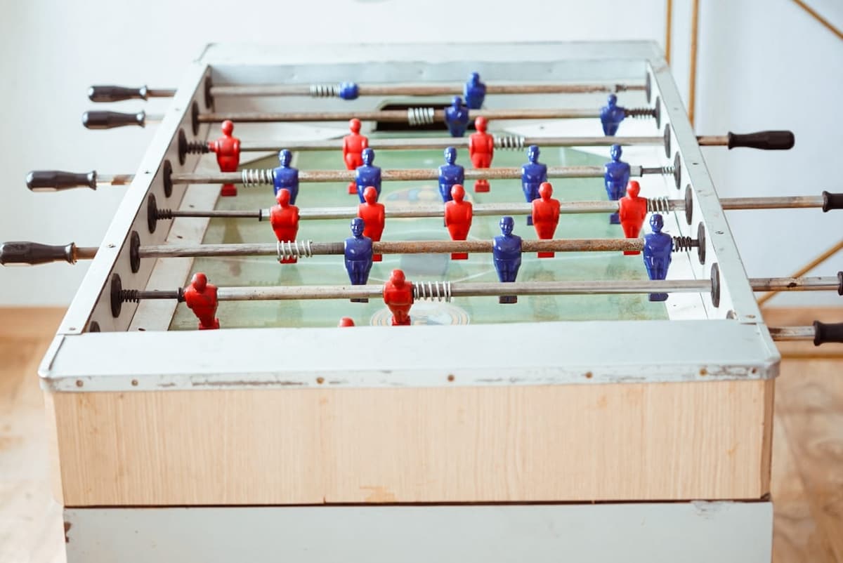 Espace de loisirs au premier étage de 120 m², avec babyfoot, billard américain, ping-pong, TV 55″, vidéoprojecteur, écran de projection, table à manger pour 20 personnes, jeux de société et jeux de fléchettes
