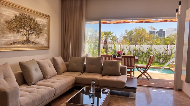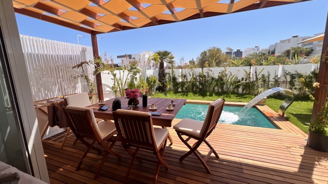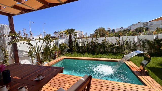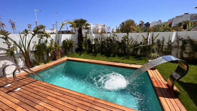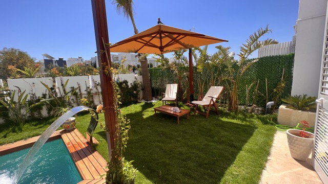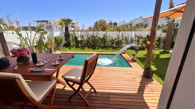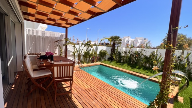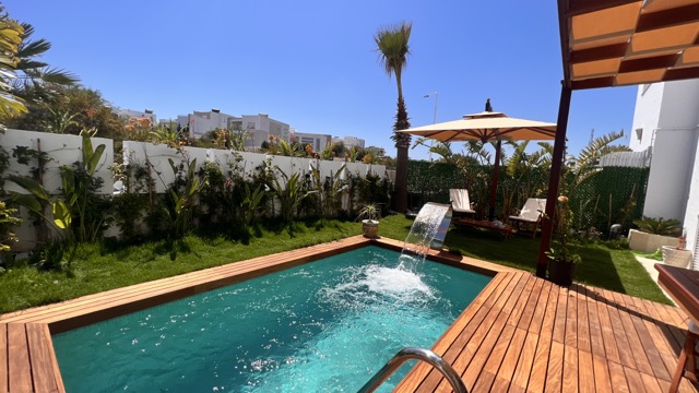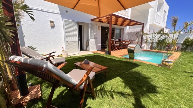 Le logement se compose d’une suite parentale avec TV, WC et douche privée, ainsi qu’une chambre à l’étage. Au rez-de-chaussée, vous trouverez un séjour lumineux, une cuisine moderne entièrement équipée, une salle d’eau et un jardin agréable donnant sur une magnifique piscine privée (4 m x 2,30 m, profondeur 2,20 m).