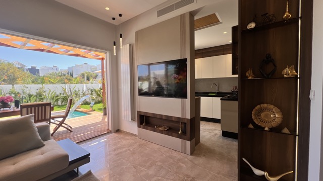 Entièrement climatisé, ce duplex offre tout le confort nécessaire pour un séjour premium. Il est idéalement situé à seulement 300 m de la plus belle plage d’El Mansourah à Kélibia, à proximité de l’hôtel Kélibia Beach.