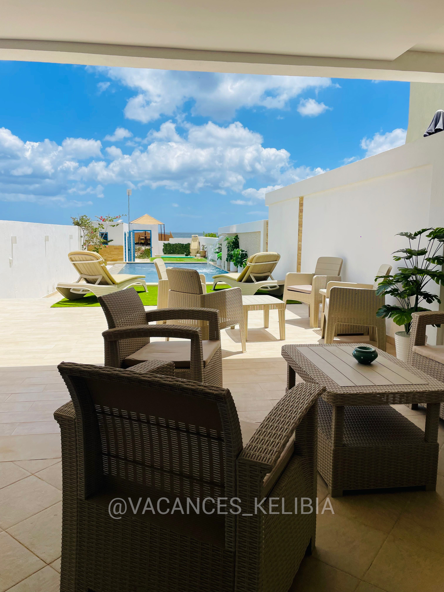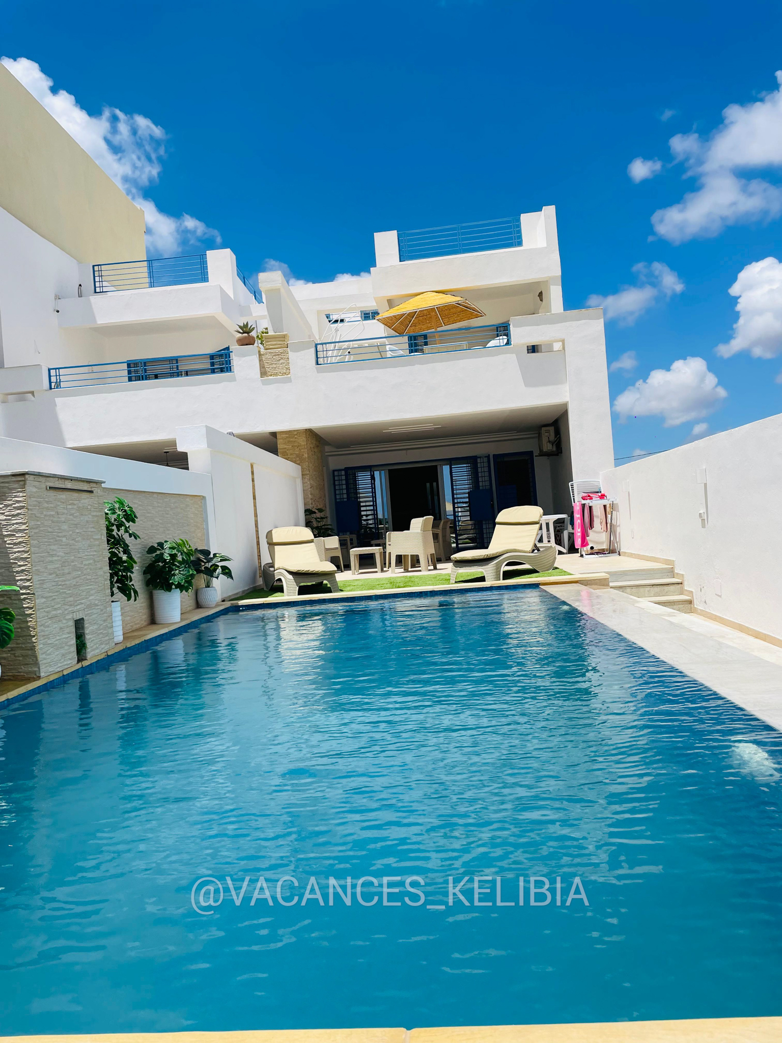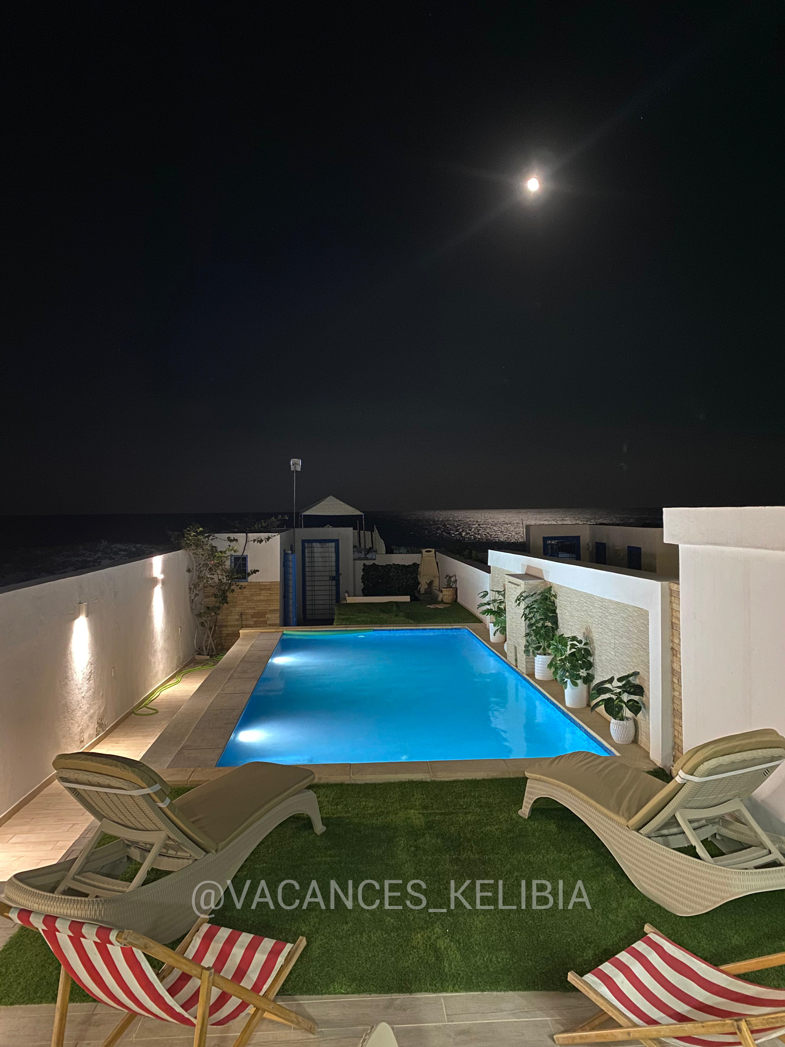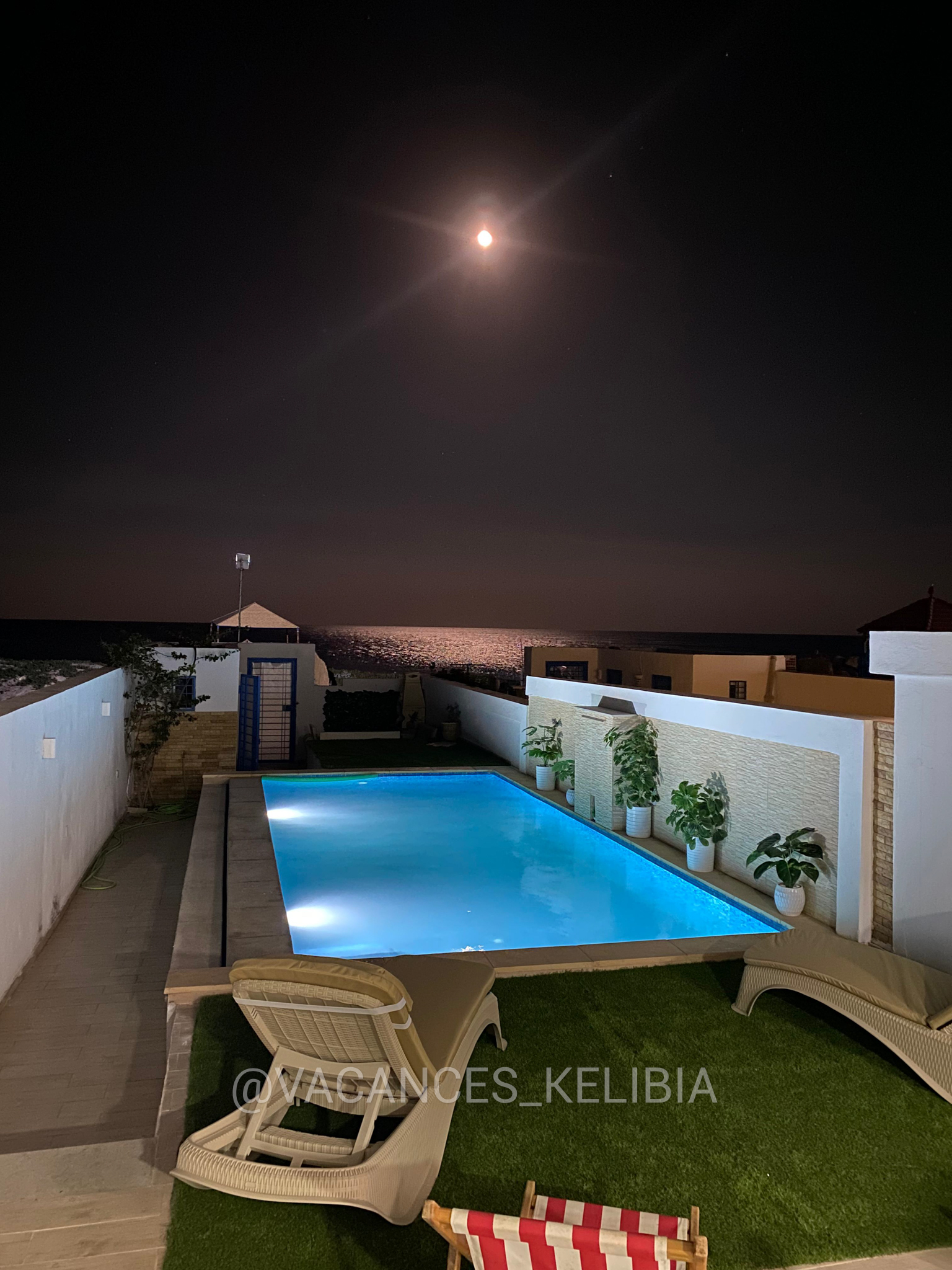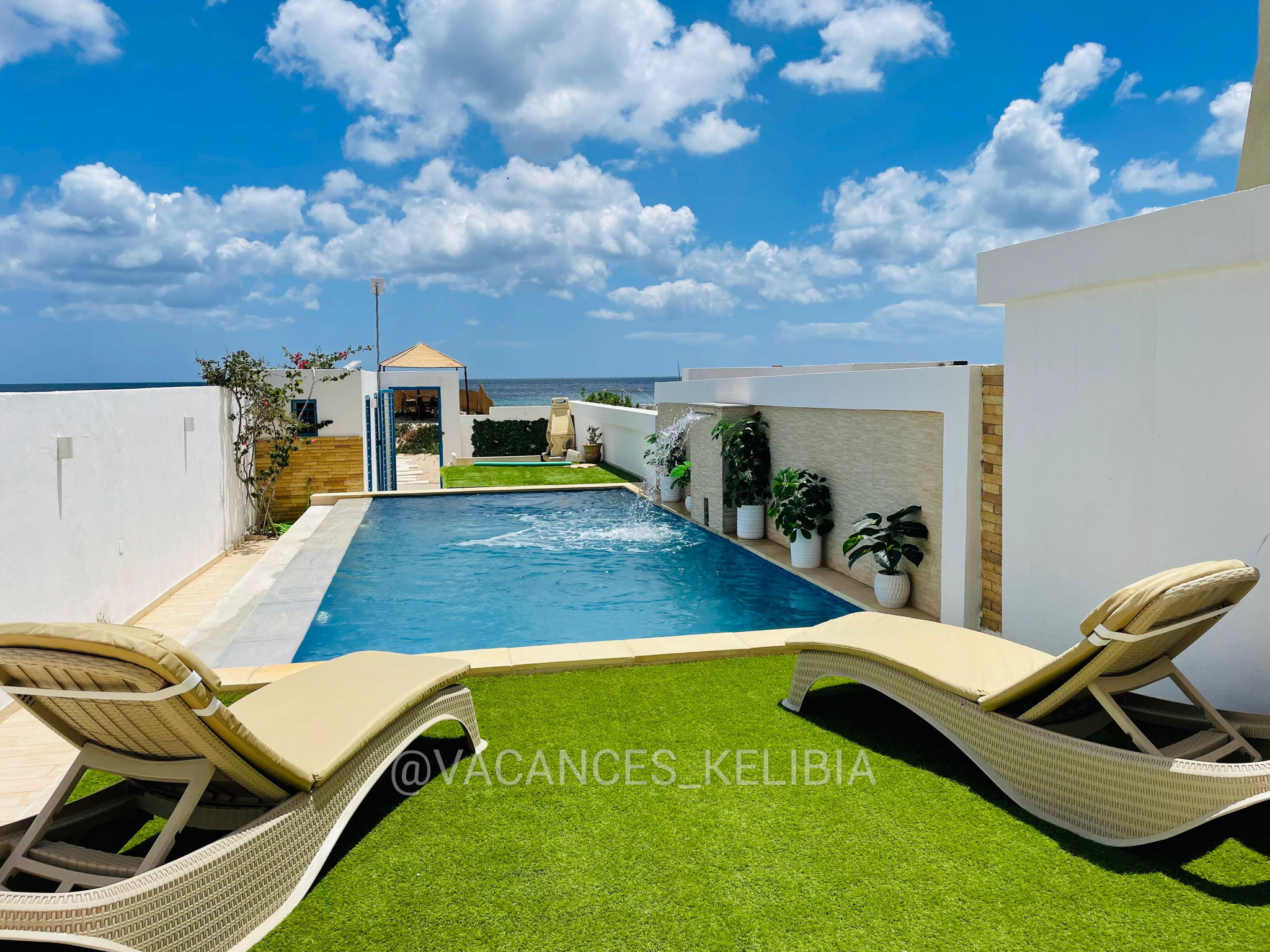Vacances Kelibia, vous propose cette villa S+4 pieds dans l’eau avec piscine , spacieuse, haut standing climatisés située dans une zone calme à Kélibia