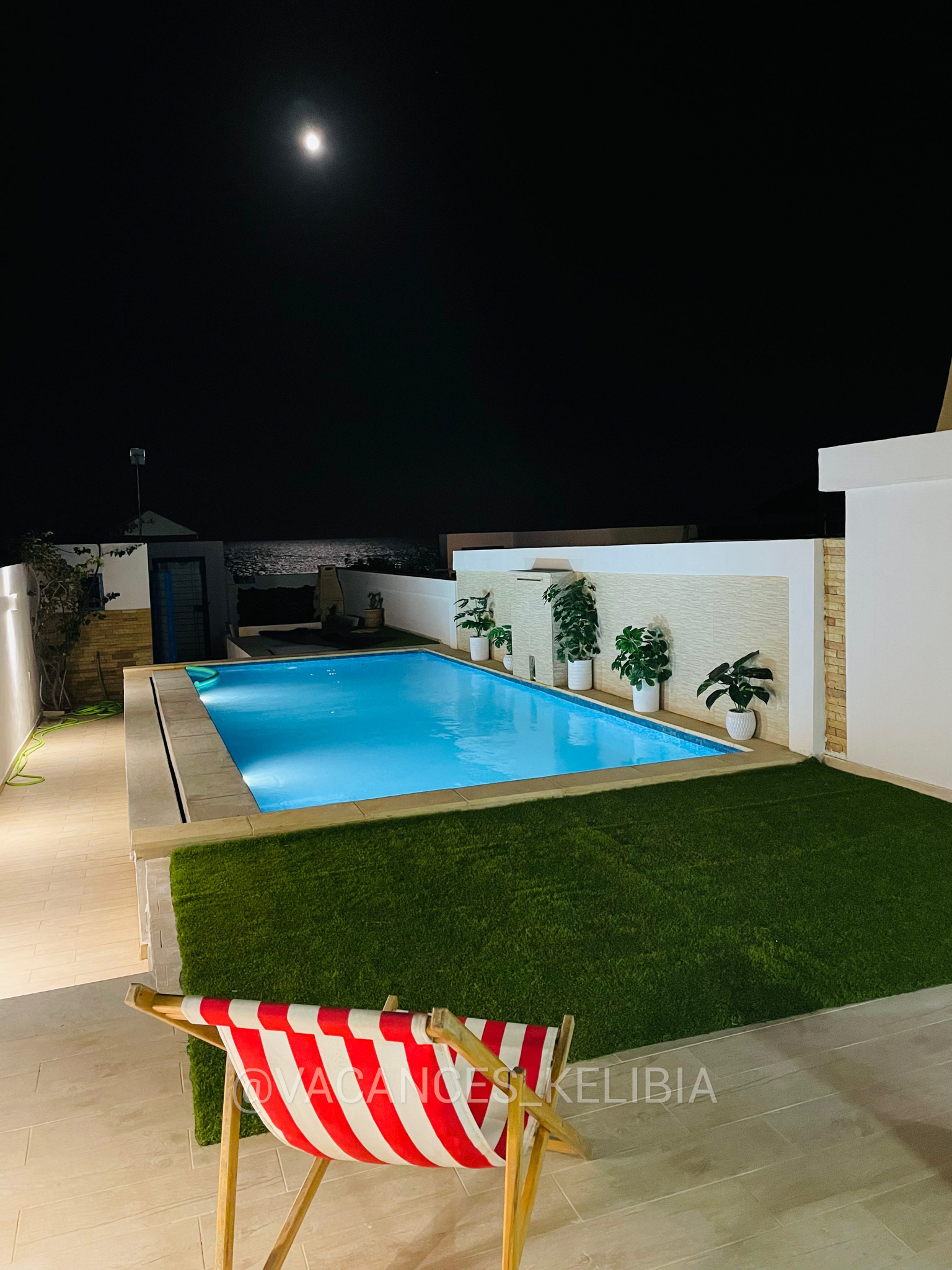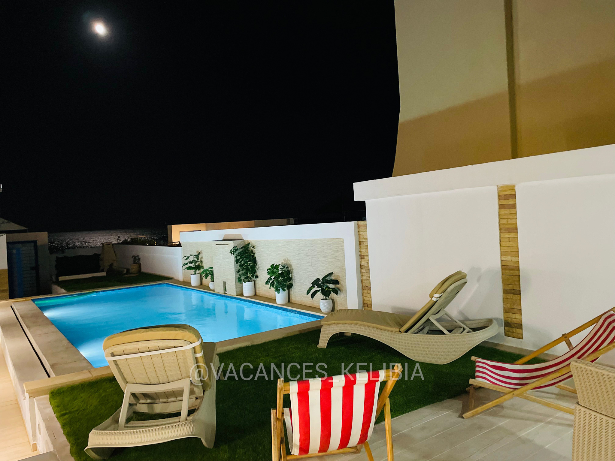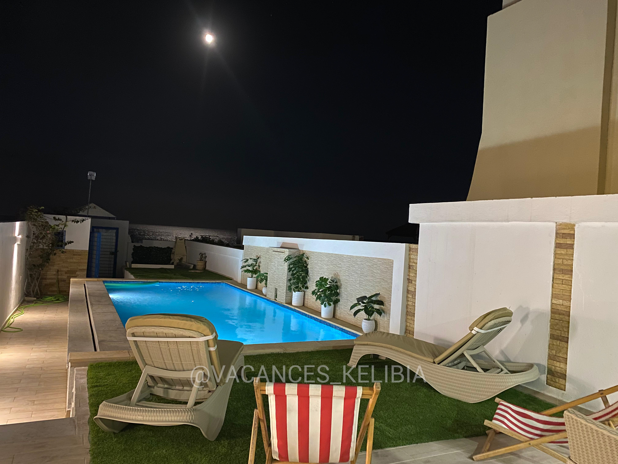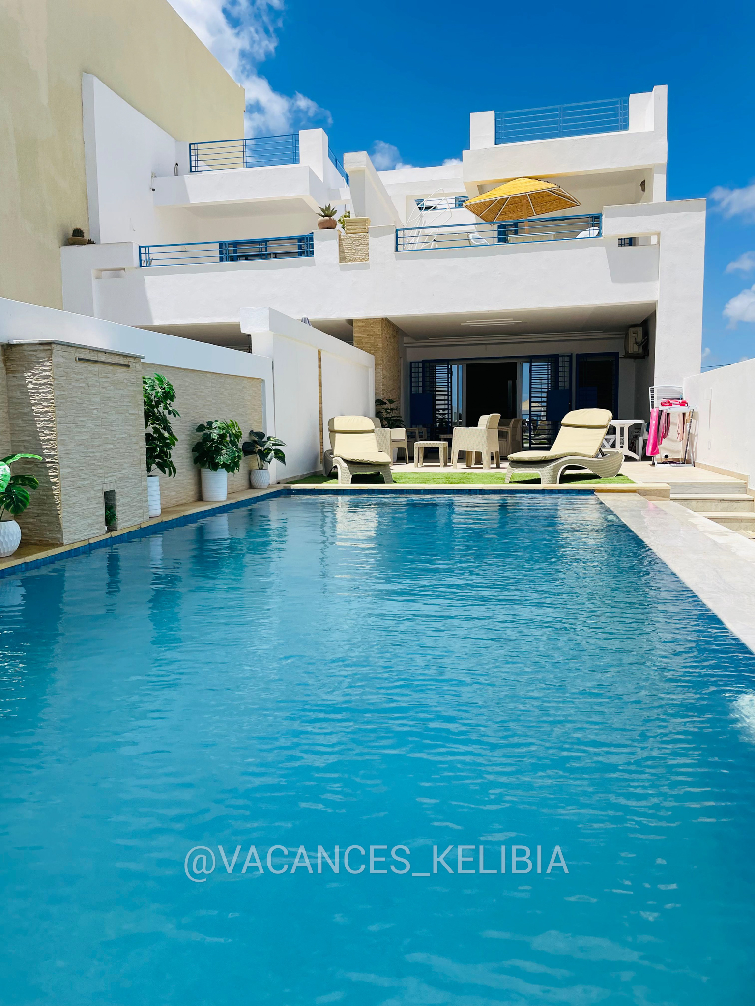 Vacances Kelibia, vous propose cette villa S+4 pieds dans l’eau avec piscine , spacieuse, haut standing climatisés située dans une zone calme à Kélibia
